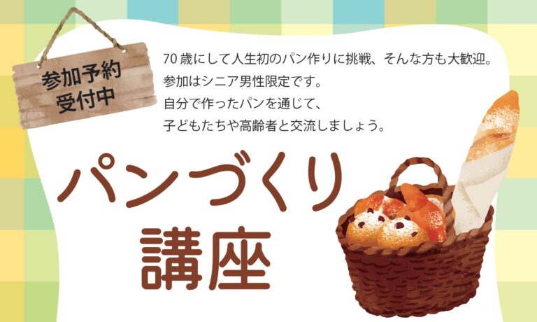 2026年1月29日・2月12日・2月26日 70 歳にして人生初のパン作りに挑戦、そんな方を歓迎します。参加対象はシニア男性。自分で作ったパンを通じて、子どもたちをはじめ地域の人と交流しましょう。 パン酵母についてもレ … 続きを読む パンじいちゃん活動をごいっしょに! シニア男性のための「パンづくり講座」